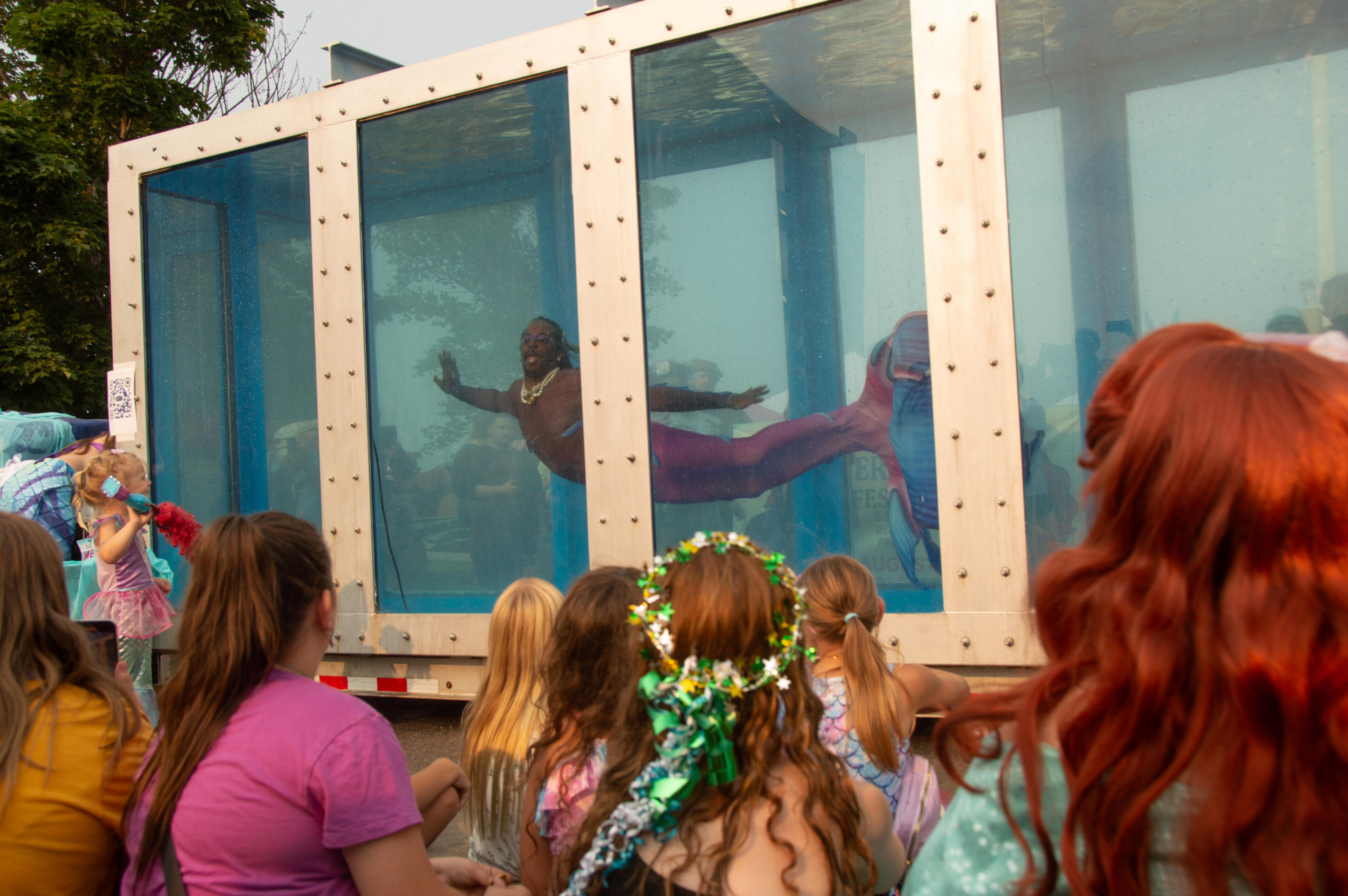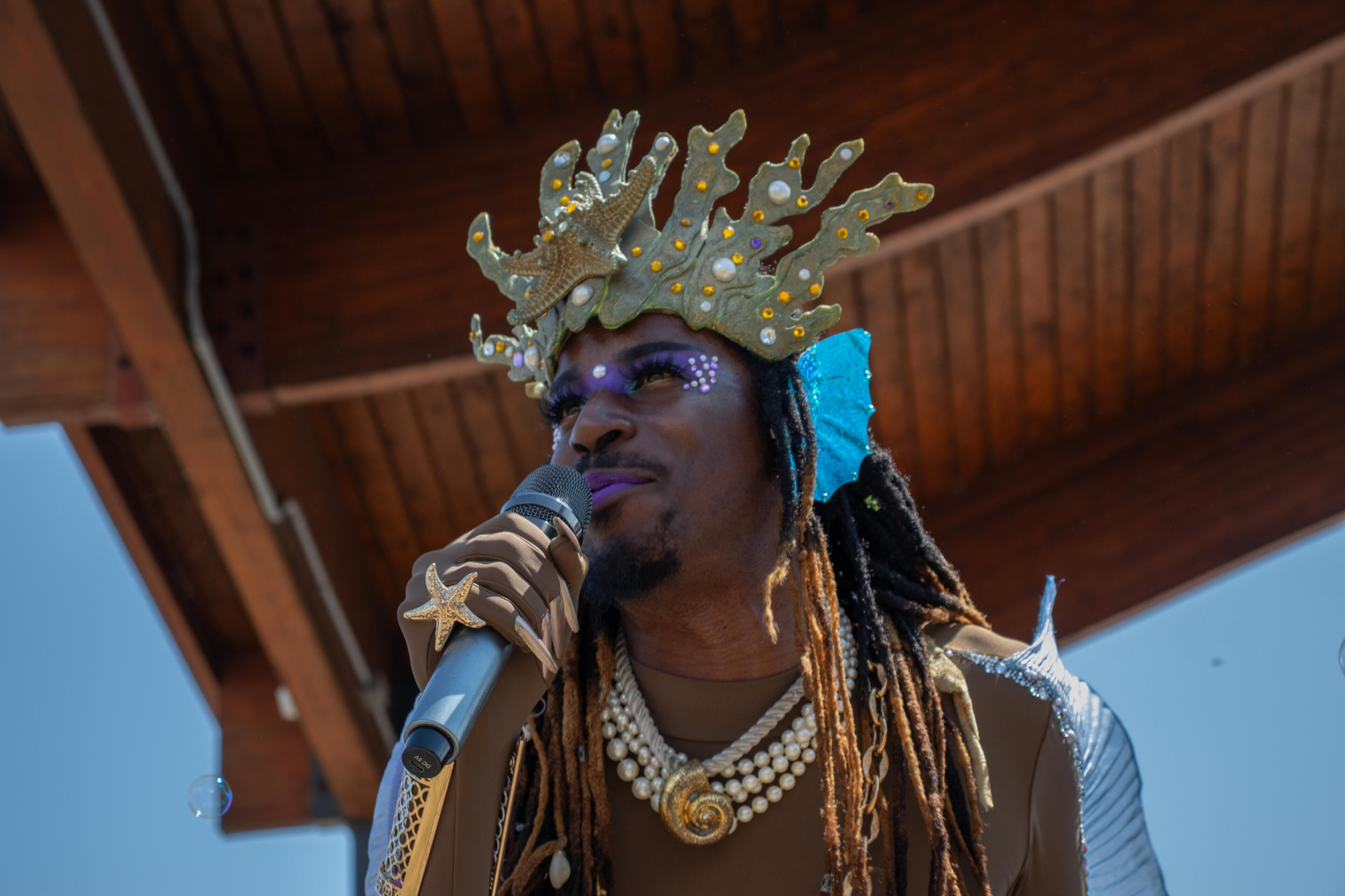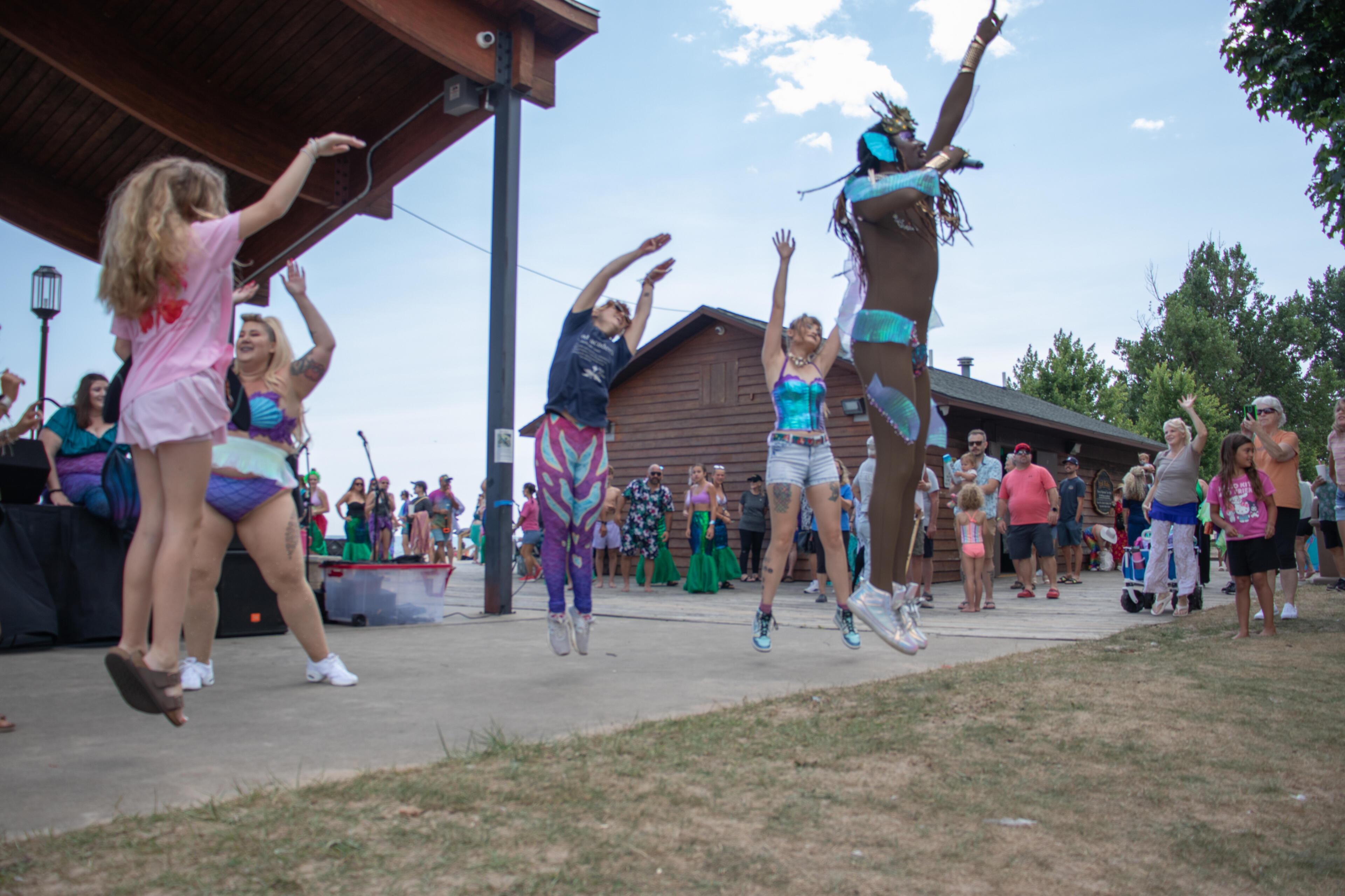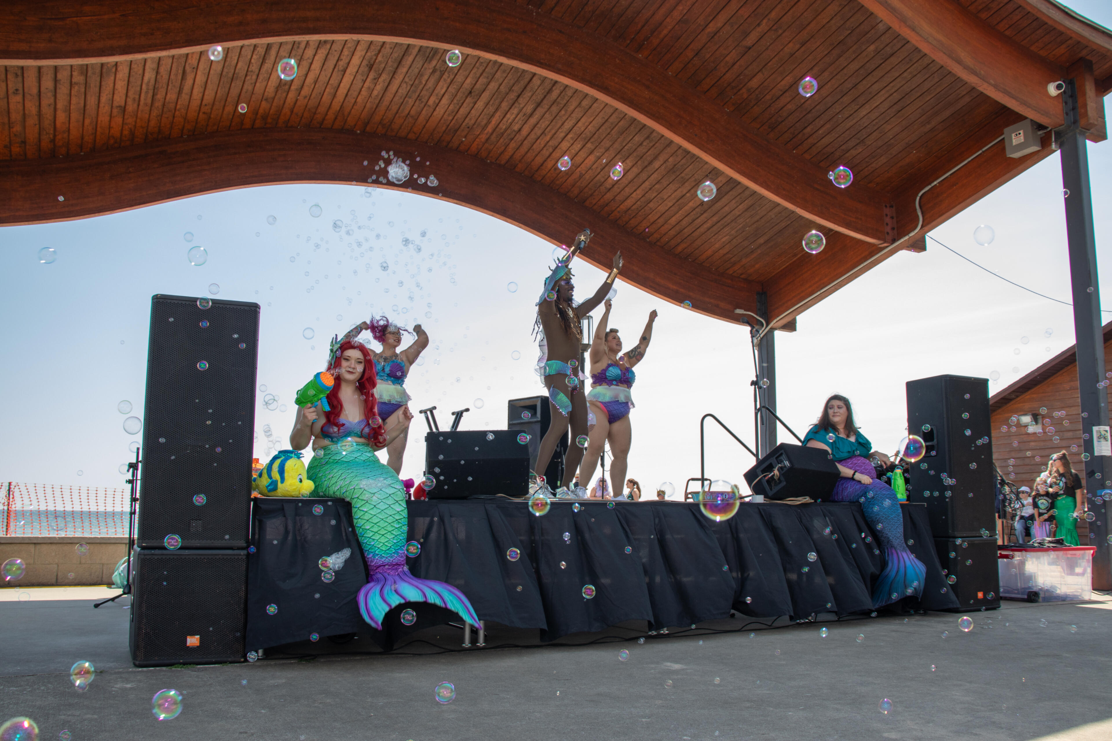 Blix Tsunami Performs on stage at the 2025 Pirates and Mermaids Festival in Oscoda before 500 merpeople set the world record for largest gathering of merpeople.